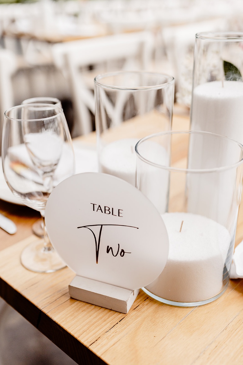 Tables, chairs, white linen, napkins, cake plinth & knife, wishing well, easels, and table numbers